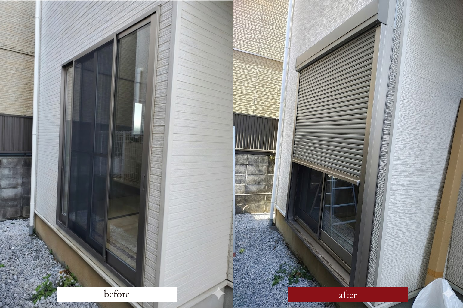 工事前は窓周辺に雨だれの跡も見え始めていましたが、シャッターボックスが取り付くことで見た目もすっきり。お客様からは「こんなに印象が変わるとは思わなかった」「夜シャッターを下ろすと静かで安心する」というお声をいただきました。