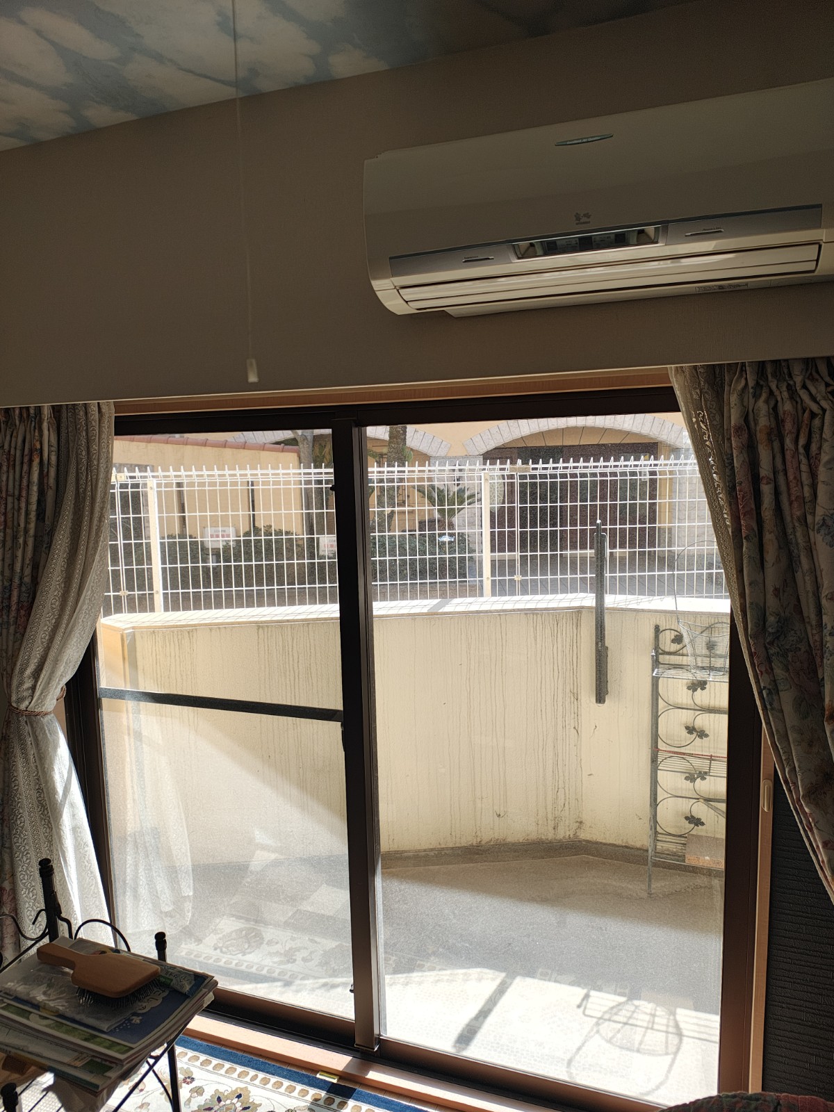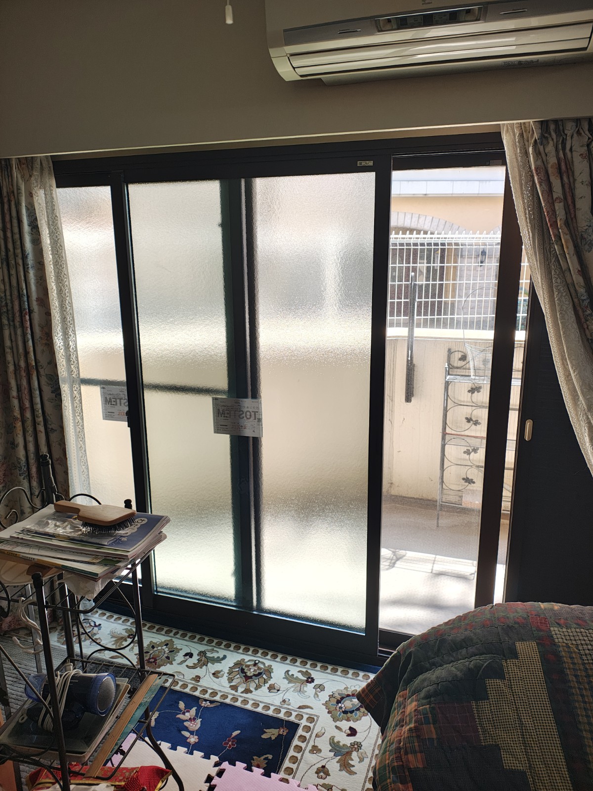 施工前の写真を見ると、ベランダに面した大きな掃き出し窓にはアルミサッシの引き違い窓が設置されており、バルコニーのフェンスや向かいの建物がはっきりと見通せる状態でした。窓の上部にはエアコンが設置されているものの、面積の大きい掃き出し窓からの熱損失が大きく、暖房効率が著しく低下していました。カーテンだけでは断熱にも目隠しにも限界があり、根本的な対策が必要な状態です。